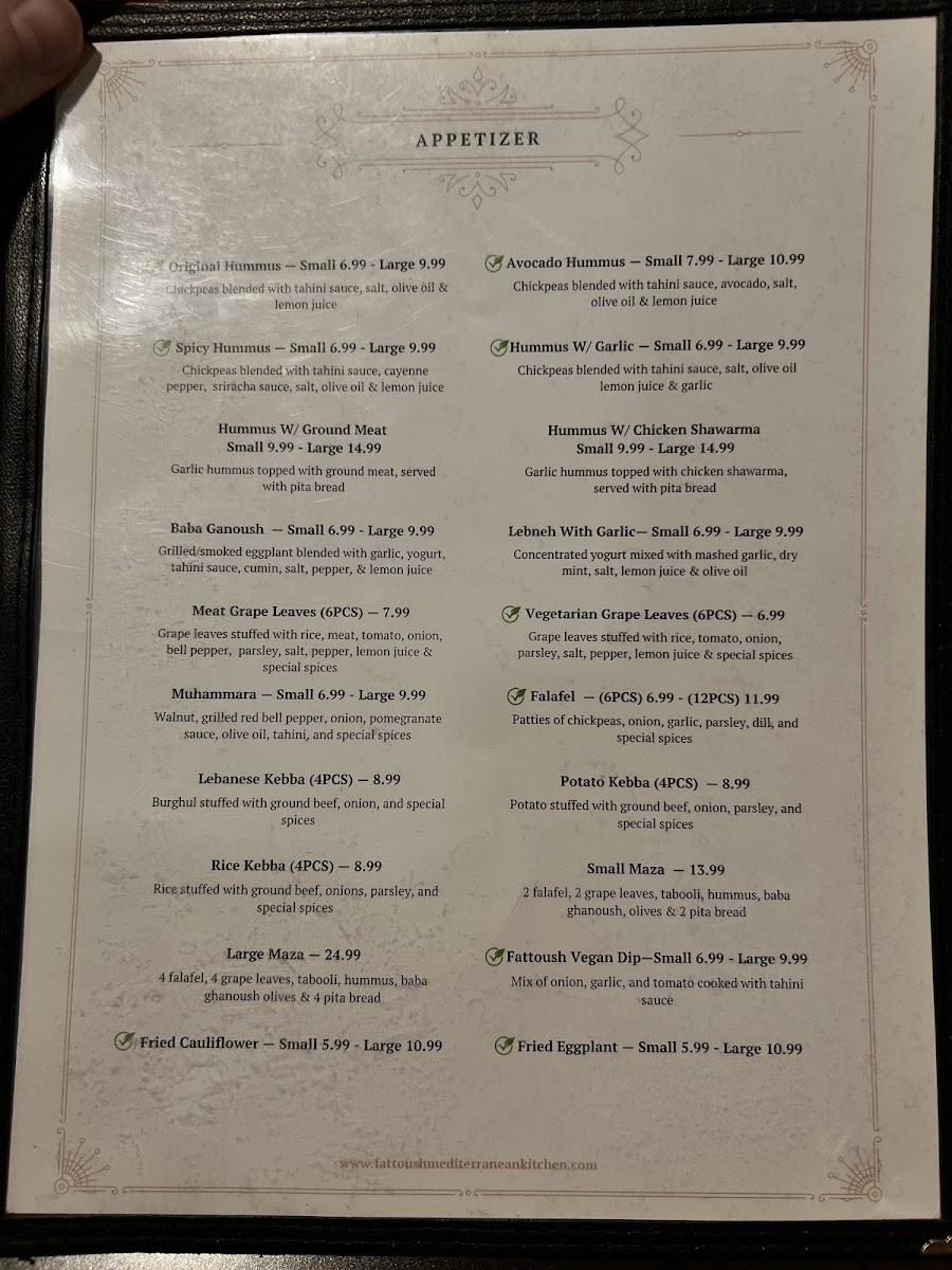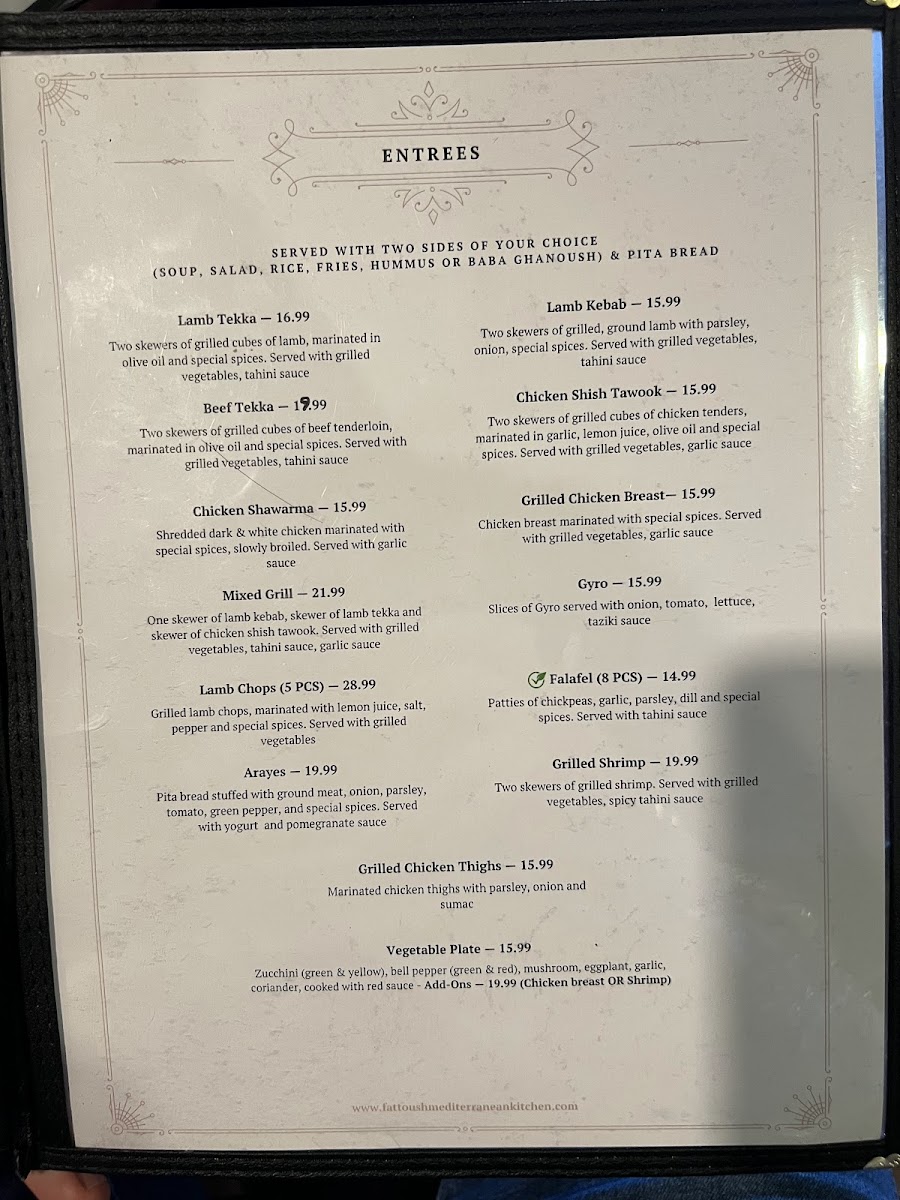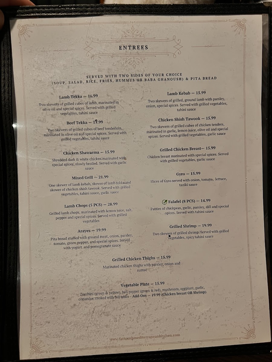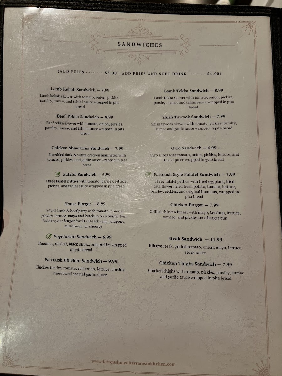 Don't miss the authentic Iraqi-style dishes, which elevate traditional kababs with sides like fresh Arabic salad, original hummus, grilled tomatoes, and house pickles. Every dish reflects an unwavering commitment to flavor, quality, and tradition, making Fattoush a treasured dining destination for locals and visitors alike.