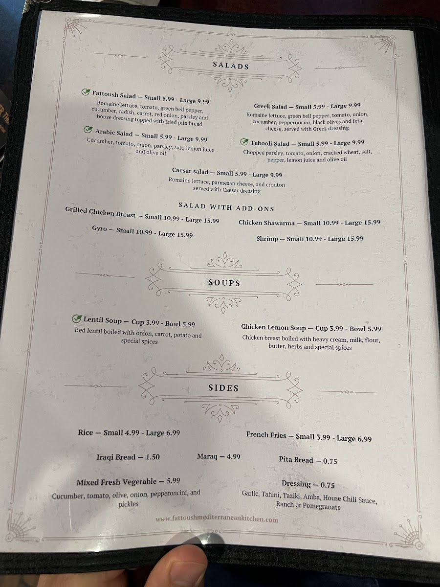 Introducing the menu at Fattoush Restaurant, a Mediterranean gem nestled in Pantego, TX. This eatery masterfully blends authentic Iraqi and Middle Eastern flavors with fresh, high-quality ingredients. Start your culinary journey with comforting soups like the hearty Lentil Soup or the creamy, herb-infused Chicken Lemon Soup.